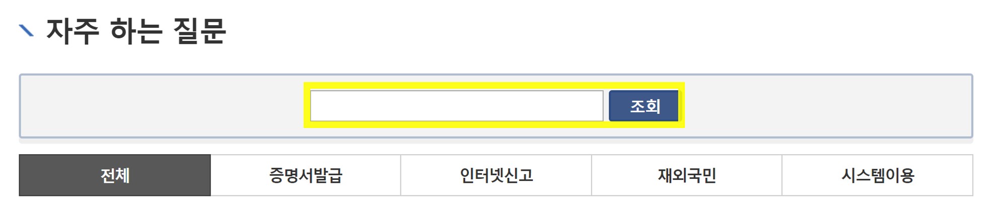 검색어를 입력하고 조회를 터치하면 유사한 질문과 답변을 바로 확인할 수 있습니다. 사이트 이용, 증명서발급, 인터넷신고, 재외국민 등에 대한 질문과 답변을 볼 수 있습니다.