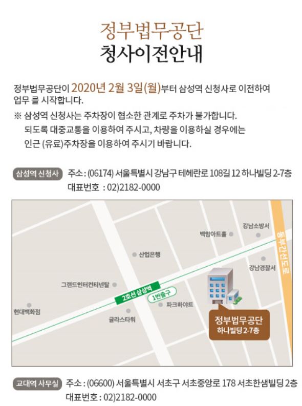 2. 홈페이지에 접속하면 정부 법무공단 위치에 대한 안내 그리고 이전 소식이 있습니다. 현재는 삼성역 그리고 교대역 부근에 공단이 있습니다.