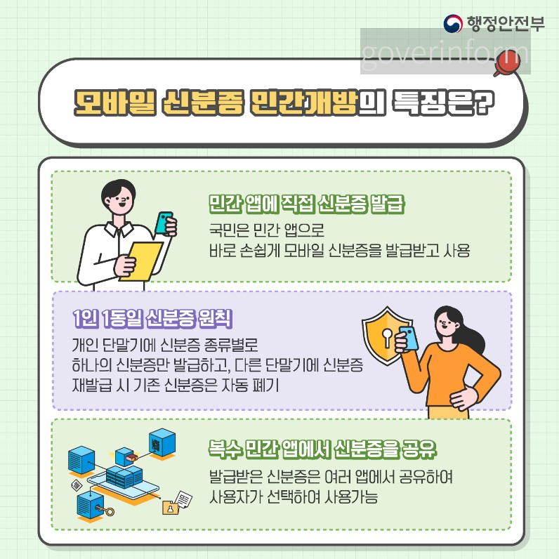 - 복수 민간앱에서 신분증을 공유: 발급받은 신분증은 여러 앱에서 공유하여 사용자가 선택하여 사용 가능