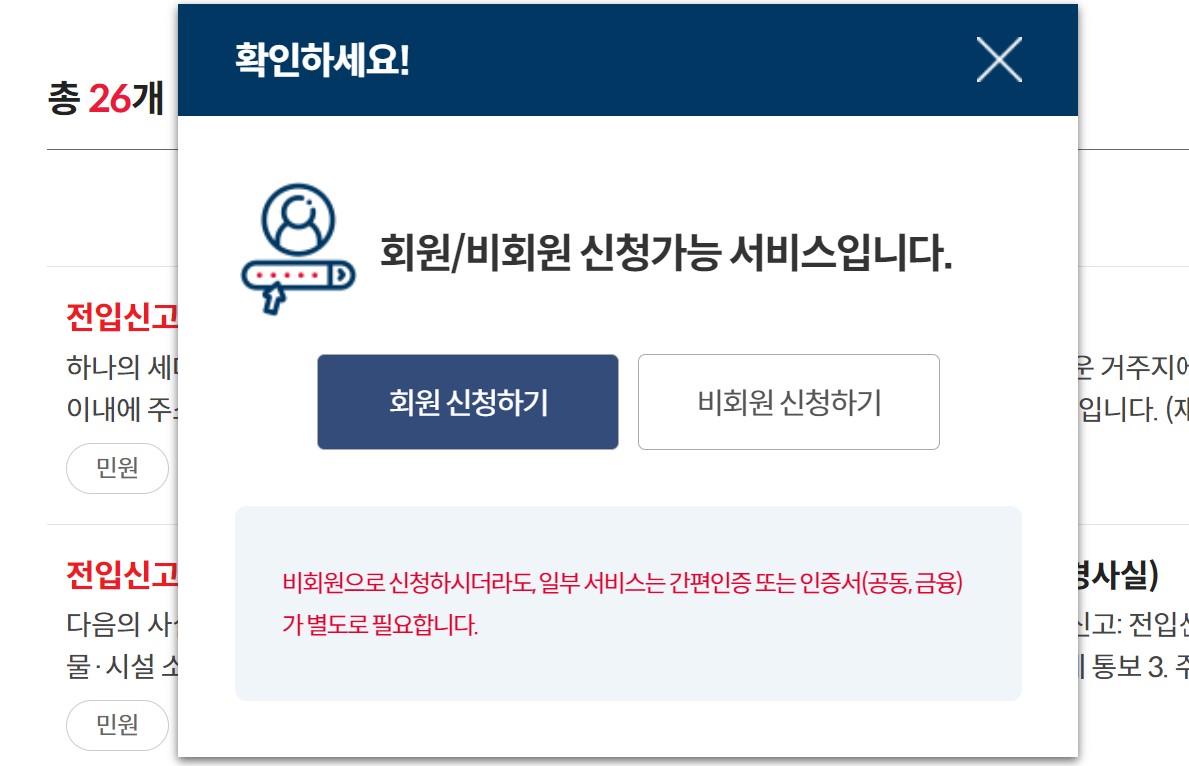 비회원으로 신청하더라도 일부 서비스는 간편 인증 또는 인증서(공동, 금융)가 별도로 필요합니다.