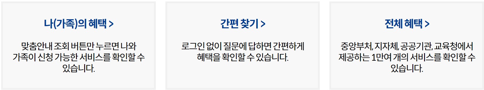 중앙부처, 지자체, 공공기관에서 현금, 현물, 바우처 이용권 등 약 1만여 개의 수혜서비스를 안내하고 이중 맞춤안내가 간음한 약 6천2백 여종의 서비스를 대상으로 나, 가족이 받을 수 있는 정부혜택을 한 번에 확인 및 신청을 할 수 있습니다.