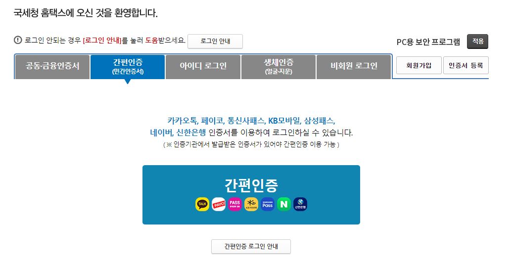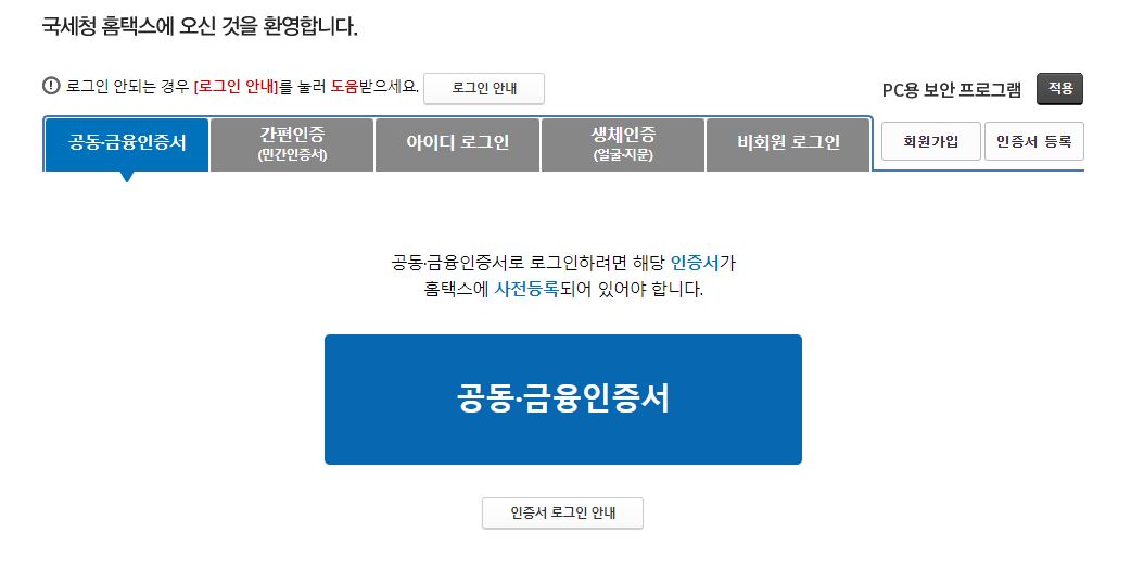 공동·금융인증서 로그인을 합니다. 간편인증(민간인증서), 아이디 로그인, 생체인증, 비회원 로그인으로도 인증 가능하며, 인증 후에 서비스 이용을 할 수 있습니다.