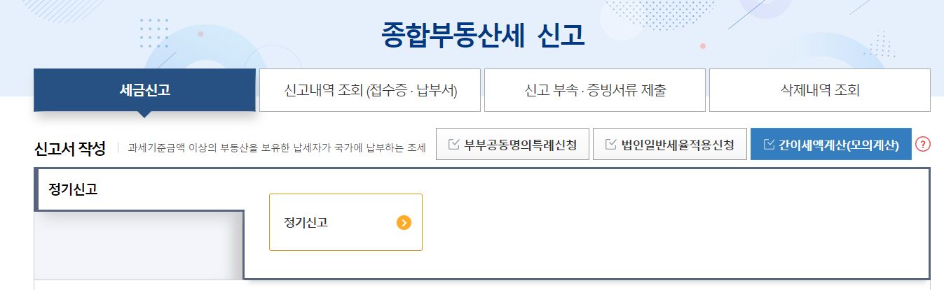 종합부동산세 신고 창이 로그인 후에 다시 나오게 되고 다시한번 "신고서 작성)정기신고" 순으로 입장합니다.