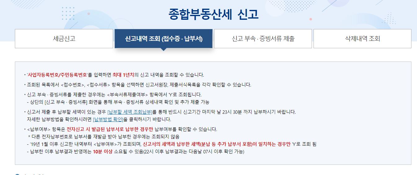 종합부동산세 정기신고 후 "신고내역 조회"도 신청 창에서 확인할 수 있습니다. 최대 1년치 신고 내역 조회를 할 수 있습니다. 조회된 목록에서 접수번호, 접수서류 항목을 선택하면 신고서원장, 제출서식목록을 각각 확인할 수 있습니다.