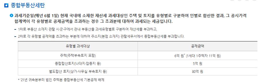 주택은 공제금액이 6억원이고, 종합합산토지는 5억원, 별도합산 토지는 80억원이 공제금액 입니다.