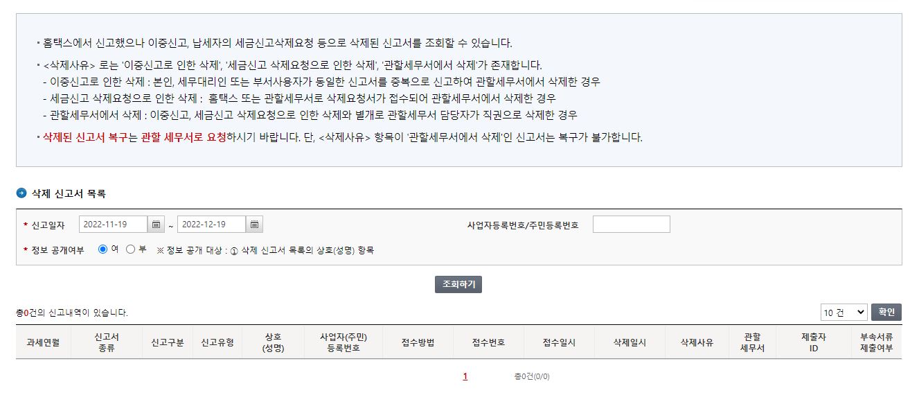 홈택스에서 신고했으나 이중신고했거나 납세자의 세금신고삭제요청 등으로 삭제가 된 조회서도 확인할 수 있습니다.