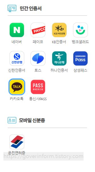 간편인증을 클릭했더니 카카오톡이나 기타 인증가능한 민간 인증서 목록을 보여줍니다. 여기서 자주 이용하는 인증서를 클릭합니다. 저같은 경우는 카카오톡을 클릭했습니다. 운전면허증으로도 인증이 가능합니다.