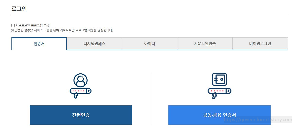 취학통지서 발급을 위해서는 간편인증이나 공동.금융인증서 중 택1 하여 로그인을 합니다.