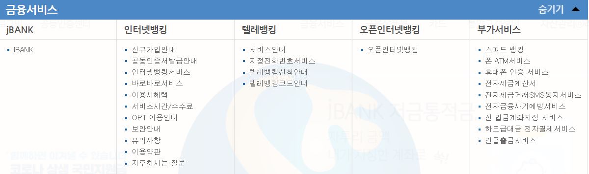 제주은행 인터넷뱅킹에서 제공하는 서비스 목록입니다.
