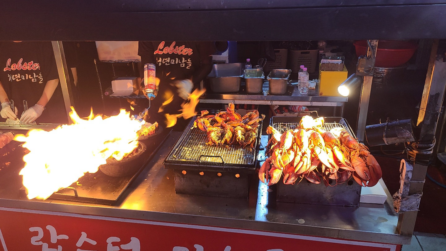 시장을 화려하게 불태웠던 랍스타구이 ㅋㅋㅋㅋ 랍스타 굽는 분이 불쇼해요 - 위험해보여요 ㅠ ㅠ 괜찮은거겠죠?