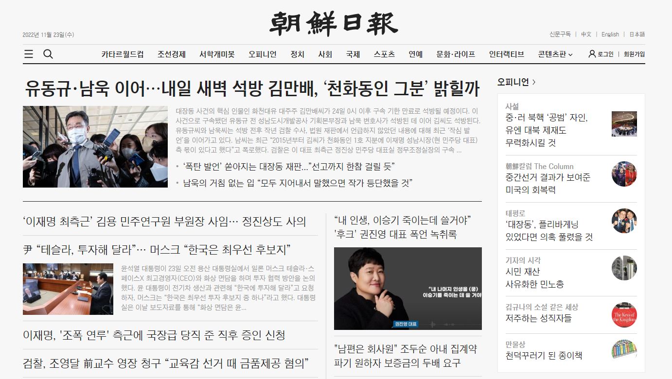 다음은 조선일보 인터넷신문입니다. 주요 내용이 신문 첫지면에 있습니다. 대표적인 메뉴는 카타르월드컵, 조선경제, 오피니언, 사회,국제,스포츠,연예,문화라이프입니다. 첫지면에 있는 기사위주로 봐도 되고 관심있는 메뉴를 먼저봐도 됩니다. 편한대로 하면 됩니다.