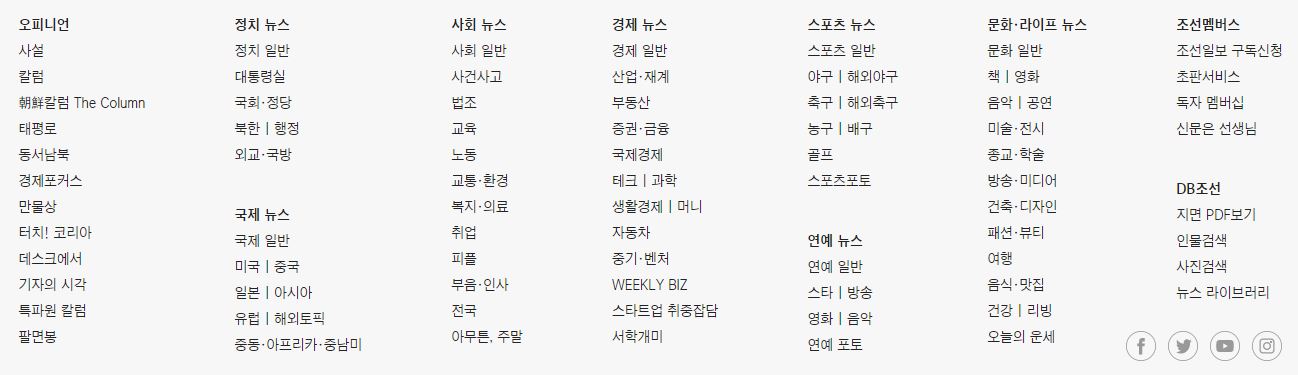 조선일보 인터넷신문 메뉴입니다. 다양한 메뉴가 있습니다. 국제뉴스도 국가별로 정리가 되어있어서 보고싶은 신문기사가 있으면 하단 메뉴를 참고해서 보는것도 좋은방법입니다. 아래 메뉴를 보려면 조선일보 인터넷 신문 바로 보기에서 하단으로 스크롤을 내리면 됩니다.