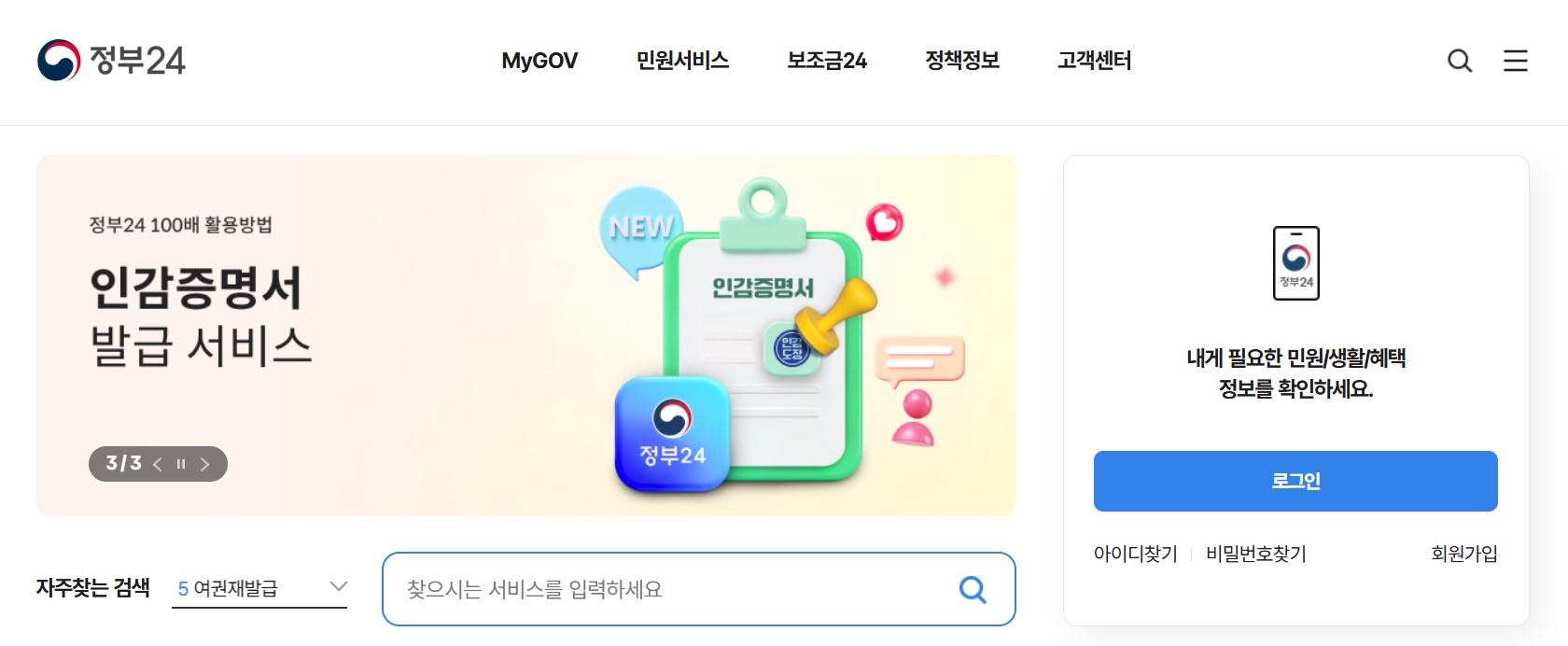 아래 정부24 홈페이지 바로가기를 터치하면 정부24 공식 홈페이지로 이동합니다.