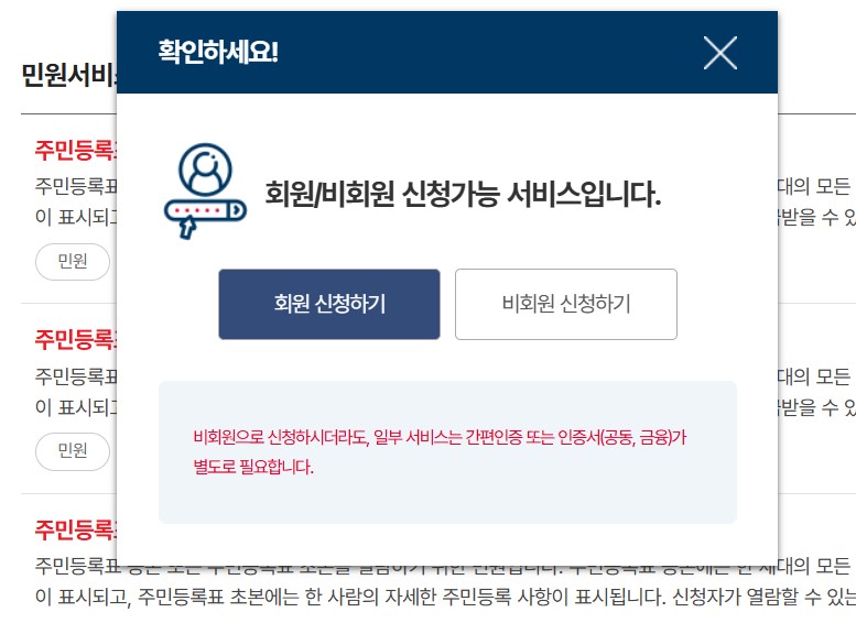 회원/비회원 신청하기 중 선택하여 로그인을 합니다. 비회원으로 신청하시더라도, 일부 서비스는 간편 인증이나 인증서(공동, 금융)가 별도로 필요합니다.