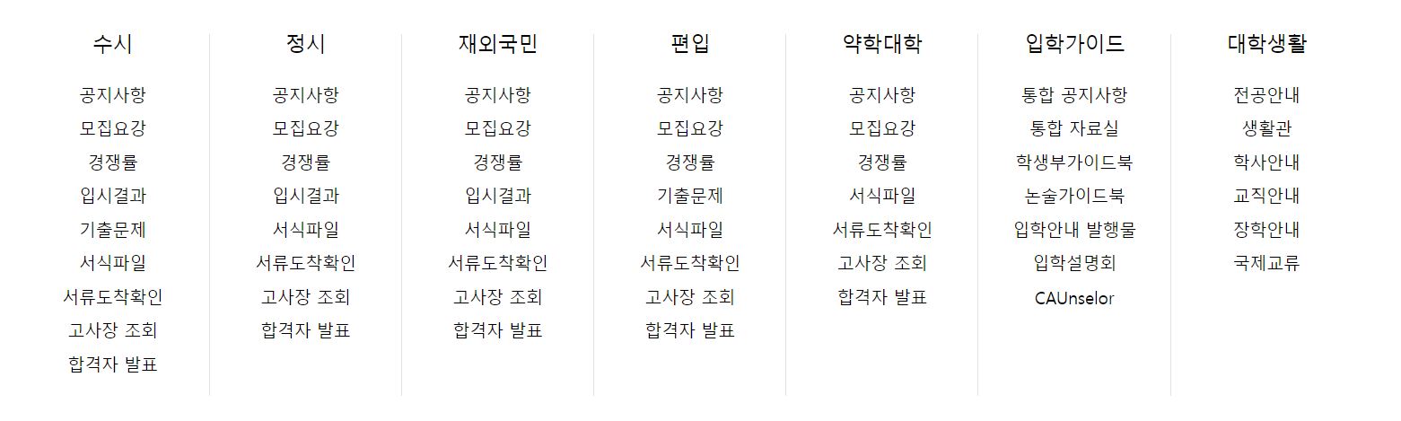 대학마다 입학처 홈페이지는 깔끔하게 정리되어있는 것 같습니다. 아무래도 다량의 정보를 전달해야하니 정리가 잘 되어있어야 쉽게 찾을 수 있을 것같습니다.