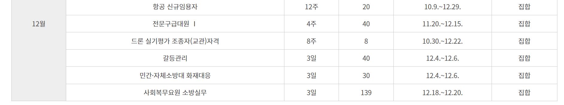 월별교육훈련일정을 보면 입교시기, 과정명, 교육기간, 교육인원, 교육일정, 방법에 대한 안내를 열람할 수 있습니다. 주요 교육훈련과정에는 신임교육, 지휘역량교육, 전문교육(집합), 공공부문, 민간부문, 글로벌 부분, 소방보조요원, 사이버교육이 있습니다. 사이버교육은 중앙소방학교 나라배움터에서 교육일정 확인 및 교육신청, 교육 수강이 가능합니다. (하단 중앙소방학교 나라배움터 바로가기 참고)