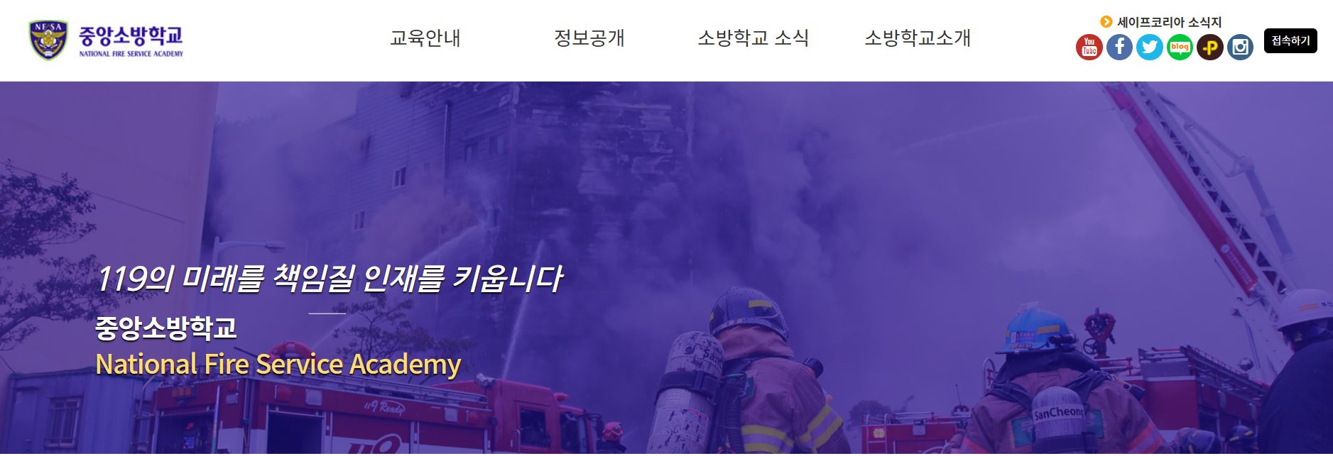 구글 검색창에 중앙소방학교를 입력하고 검색하면 중앙소방학교 홈페이지 url(https://www.nfsa.go.kr/nfsa/)이 나오고 여기에 접근하면 중앙소방학교 홈페이지 이용이 가능합니다.
