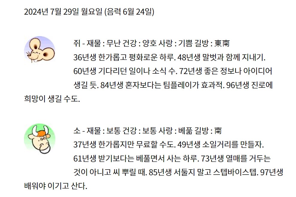 365일 매일매일 제공되는 띠별 오늘의 운세는 여기에서 지금 바로 확인할 수 있습니다.