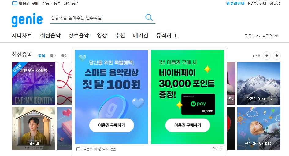 지니뮤직은 통신사(LG U+, KT) 혜택과 제휴혜택 등 다양한 이벤트를 통해 이용권 할인을 해드리고 있습니다.