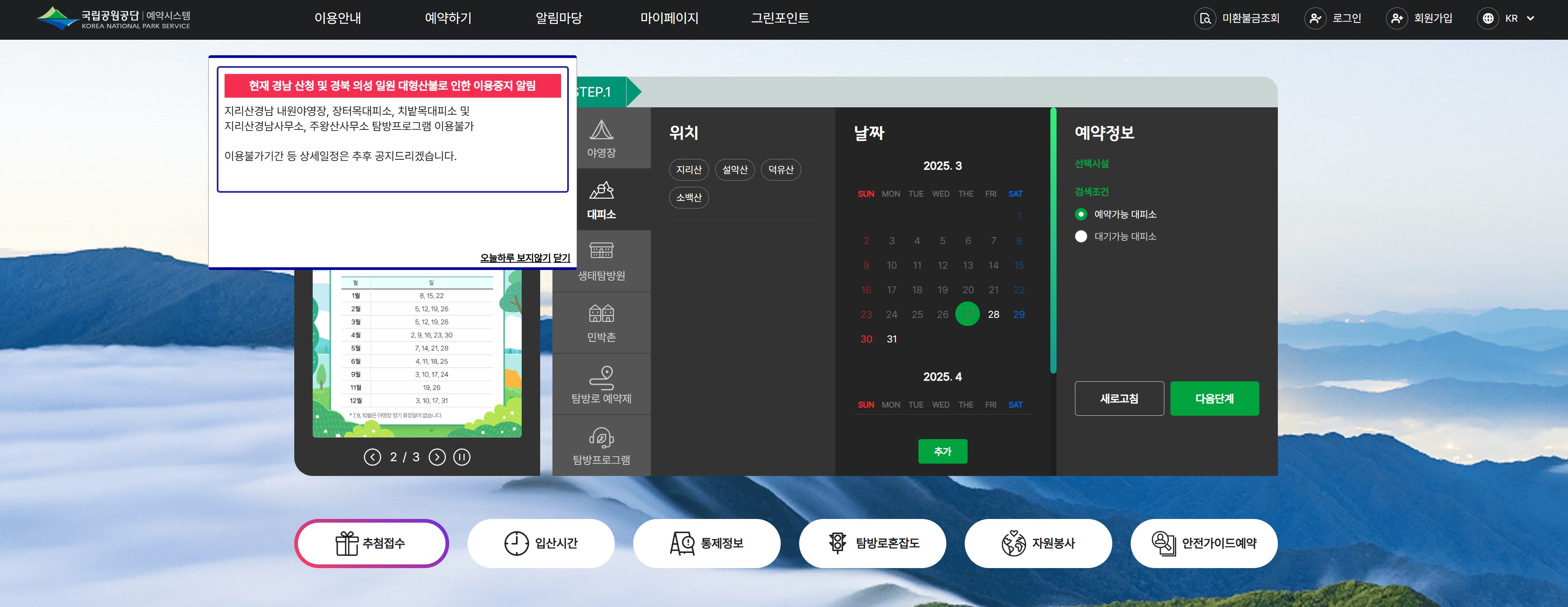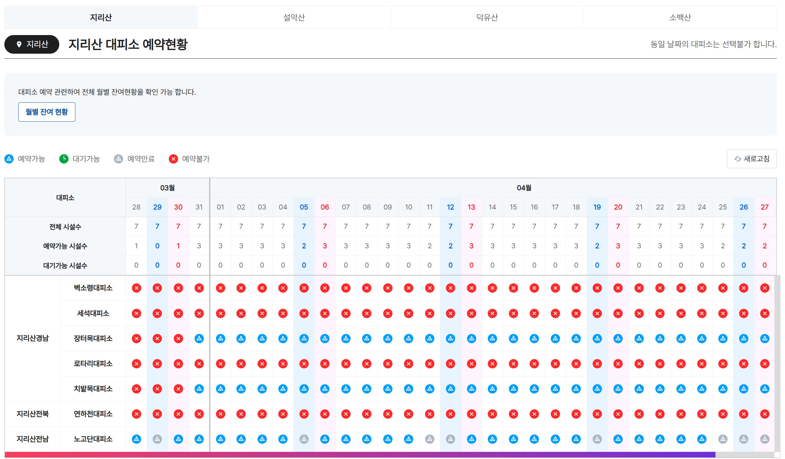 지리산 선택 시 그림에 보이는 대로 요일마다 예약할 수 있는 대피소가 나옵니다. 벽소령대피소, 세석대피소, 로터리대피소, 치밭목대피소, 연하천대피소, 노고단대피소 등이 있는데요 여기에서 장터목대피소에서 입실 가능여부를 확인하고 입실 버튼을 클릭합니다.