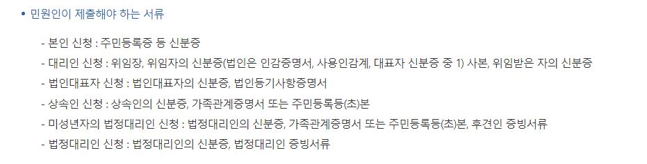 발급시 필요한 서류는 본인인 경우 1) 주민등록증 또는 기타 신분증 대리인신청인 경우 1) 위임장과 2) 위임자의 신분증 3) 위임받은 자의 신분증이 필요합니다.