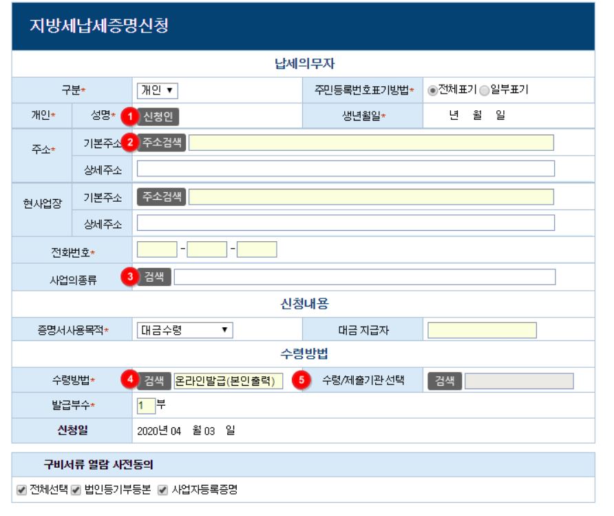 지방세 납세 증명서 신청시 아래와 같이 지방세 납세증명 신청서를 작성해야 합니다. 필수로 작성해야 하는 사항은 신청인 성명, 기본 주소, 사업의 종류, 수령방법, 수령/제출기관입니다.