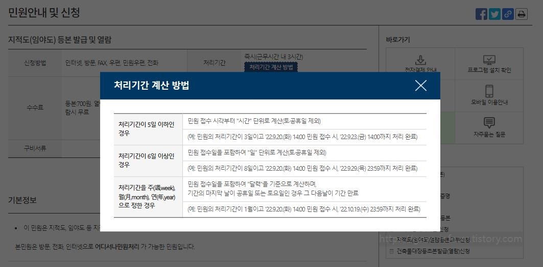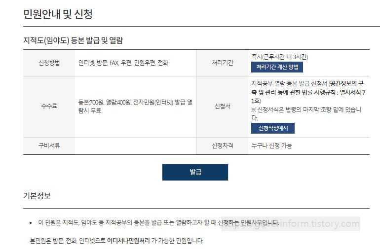 지적도 등본 발급을 하는데에 필요한 시간은 즉시. 발급이 됩니다. 무슨 일이 있어서 발급이 지연되더라도 지적도 등본의 경우 근무시간 내 3시간 이내에 발급됩니다.