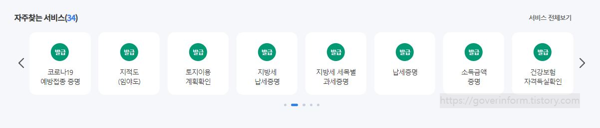 정부24 홈페이지에 접속하여 보이는 첫화면 하단에 보면 자주찾는 서비스가 있습니다. 여기에서 두번째에 있는 지적도(임야도) 발급을 클릭합니다.