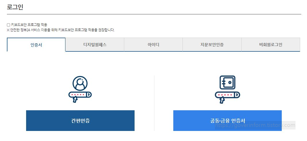 다음처럼 정부24 홈페이지에서 간편인증이나 공동 금융인증서를 발급 받습니다.