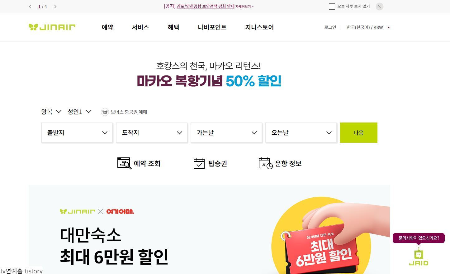진에어 홈페이지를 이용하면 다양한 소식을 볼 수 있습니다.