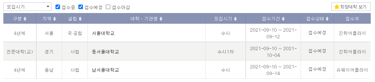 상단에 학교명 입력하는 란에 내가 지원하고자 하는 대학명을 입력하세요. 서울대학교를 입력했더니 아래처럼 국내 서울대학교라는 이름이 들어가는 대학이 나옵니다. 내가 지원하고자하는 대학을 클릭하여 접수하면 됩니다. 지금은 접수기간이 아니므로 클릭하는 곳이 없습니다. 접수기간이 되면 자동으로 클릭할 수 있게 바뀝니다.