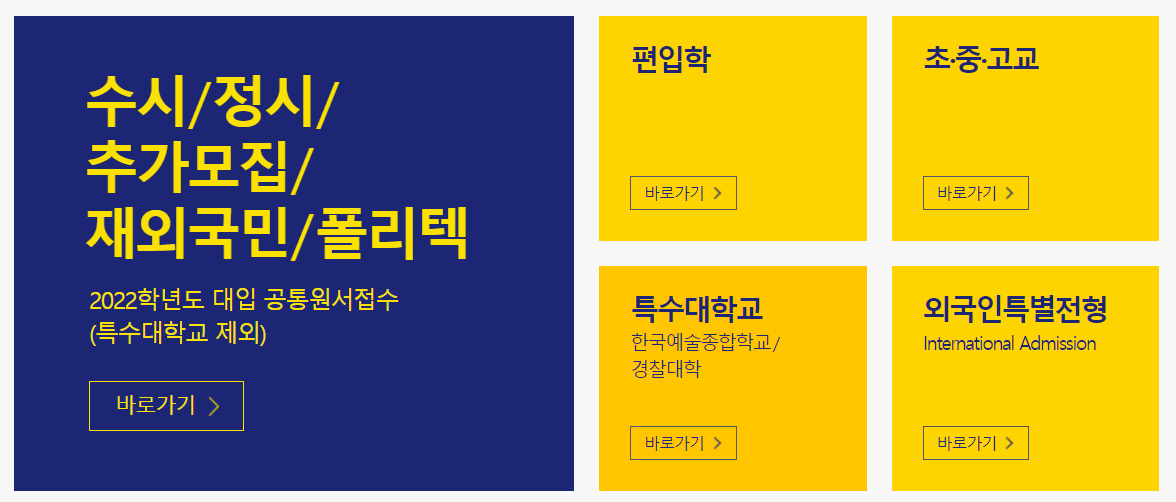 조금 아래로 내려가다 보면 수시 정시 대입 공통원서접수 바로가기가 있습니다. 해당 배너를 클릭하면 접수 페이지로 이동합니다.