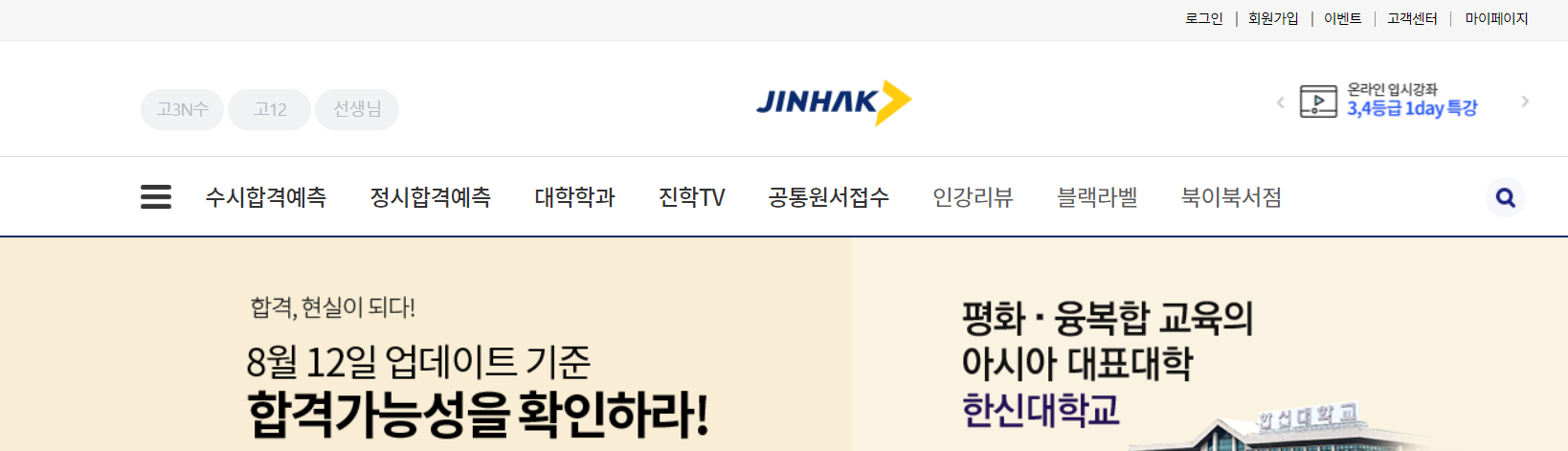 진학사 홈페이지에서 다음과 같은 첫 화면을 보게 됩니다.