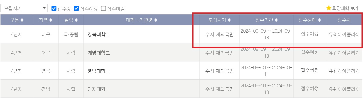 대학마다 모집시기와 접수기간 접수상태 접수처를 안내하고 있습니다.