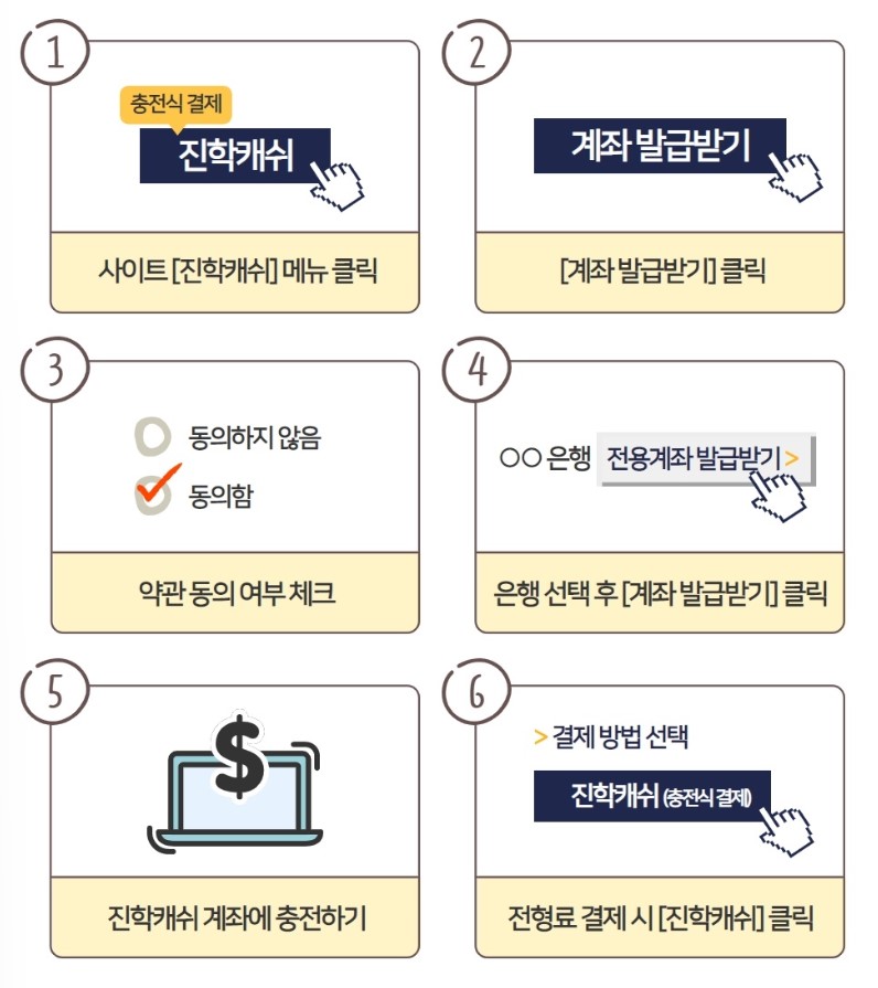 이용방법: 진학 캐쉬 > 충전하기 > 약관 동의 > 전용계좌 발급받기
