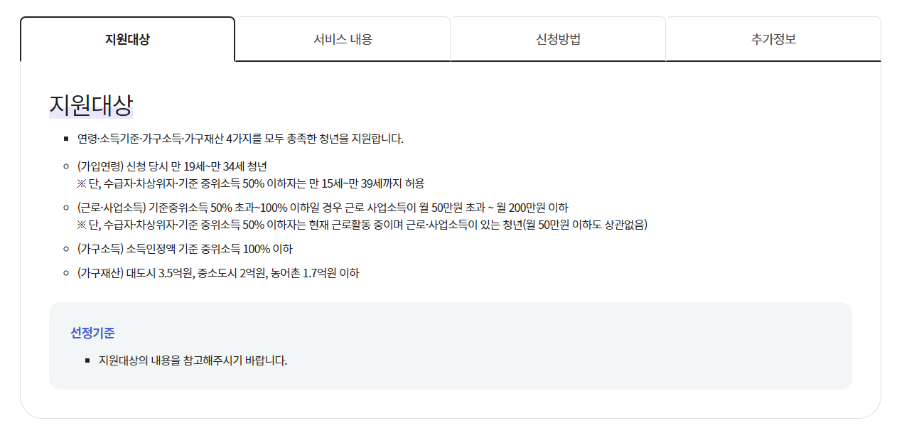 - (수급자 또는 차상위자, 중위소득 50% 이하자) 만 15세~ 만 39세