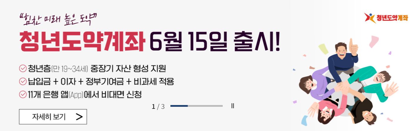 청년도약계좌는 청년(신규 가입일 기준 만 19세~34세 이하)의 중장기 자산형성을 지원하는 사업으로 6.15일부터 운영을 시작합니다. (병역이행기간-최대 6년-은 연령 계산 시 빼고 계산합니다.)