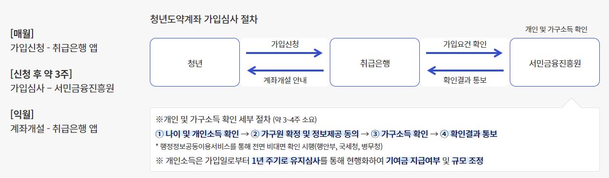 개인소득, 가구소득 요건 확인이 필요하며 서민금융진흥원((https://www.kinfa.or.kr)에서 비대면으로 확인한다. 가구소득요건 확인은 주민등록등본을 기준으로 가구원을 판단하며 가입자와 가구원의 소득조회 동의를 거쳐 이루어진다. 요건 확인이 전부 완료될 경우 가입 신청을 받은 은행에서 가입 가능여부를 안내한다.