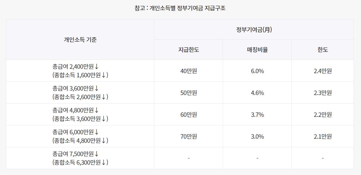 개인소득 수준 및 본인 납입 금액에 따라 정부 기여금이 매칭 지원이 되며 이자소득에 비과세(이자소득세 및 농어촌 특별세)를 제공합니다.