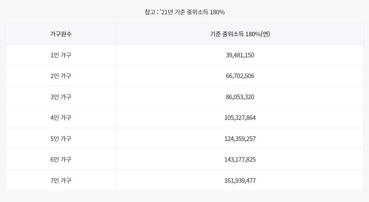 - 가구(청년 본인, 본인의 주민등록표 등본상 배우자 부모 자녀 형제자매-미성년자-를 기준으로 판단) 소득 : 가구원수에 따른 기준 중위 소득 180% 이하에 해당하는 자 * 직전 과세기간의 소득이 확정되지 않은 기간에 소득 확인을 한 경우 전전 연도 소득으로 인정