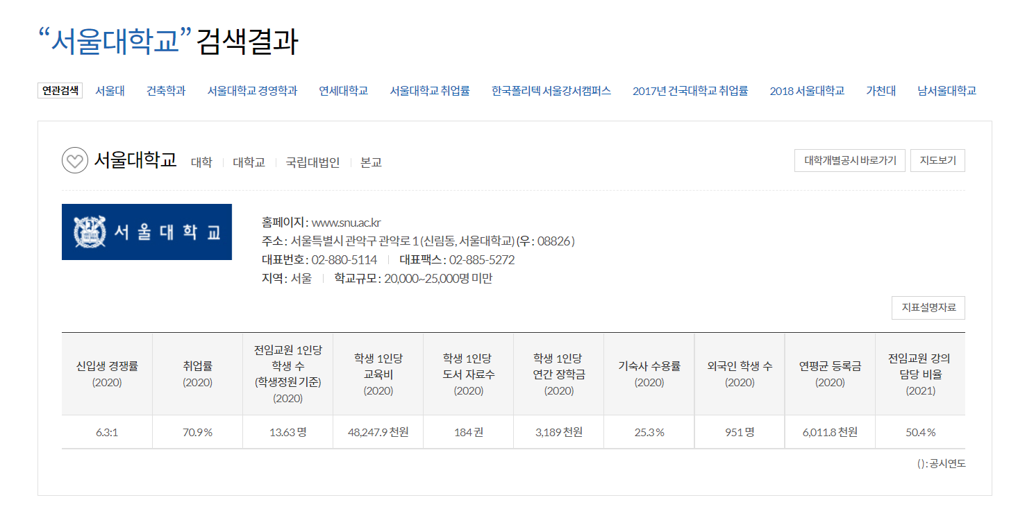 대학알리미도 있습니다. 대학알리미는 이름그대로 대학정보를 볼 수 있는 홈페이지로 학생 교원 연구진을 위해 개설되었습니다. 대학에 대한 주요 정보를 정확하고 투명하게 공개하고 있습니다. 아래와 같이 대학정보를 입력하면 신입생 경쟁률 취업률 교육비 도서자료수 장학금 학생수를 포함한 정보가 명시되어있습니다.