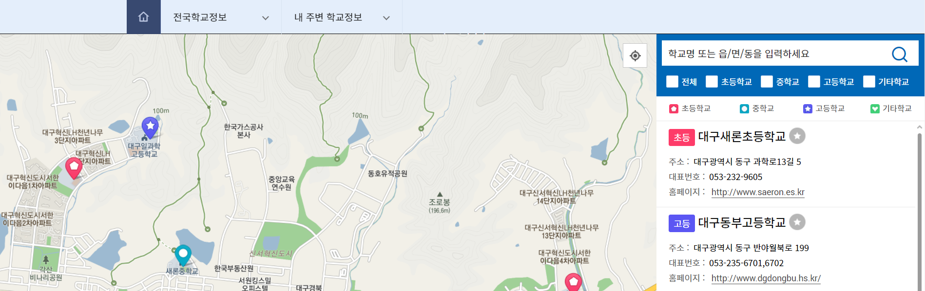 학교알리미에 접속하면 아래와같이 학교명을 입력할 수 있습니다. 초등학교명을 입력하면 급식정보 학사일정 학생현호아 교원 현황 교육활동을 포함한 다양한 정보를 볼 수 있습니다. 아직 내가 사는 지역에 어떤 학교가 있는지 모르는 분들은 내 주변 학교 찾기 서비스를 이용하면 좋습니다.