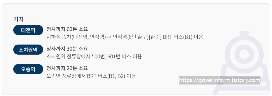 청사에 가는방법은 크게 1)기차, 2)버스, 3)자가입니다. 기차는 대전역, 조치원역, 오송역을 이용하면 됩니다. 오송역이 가장 가깝습니다.
