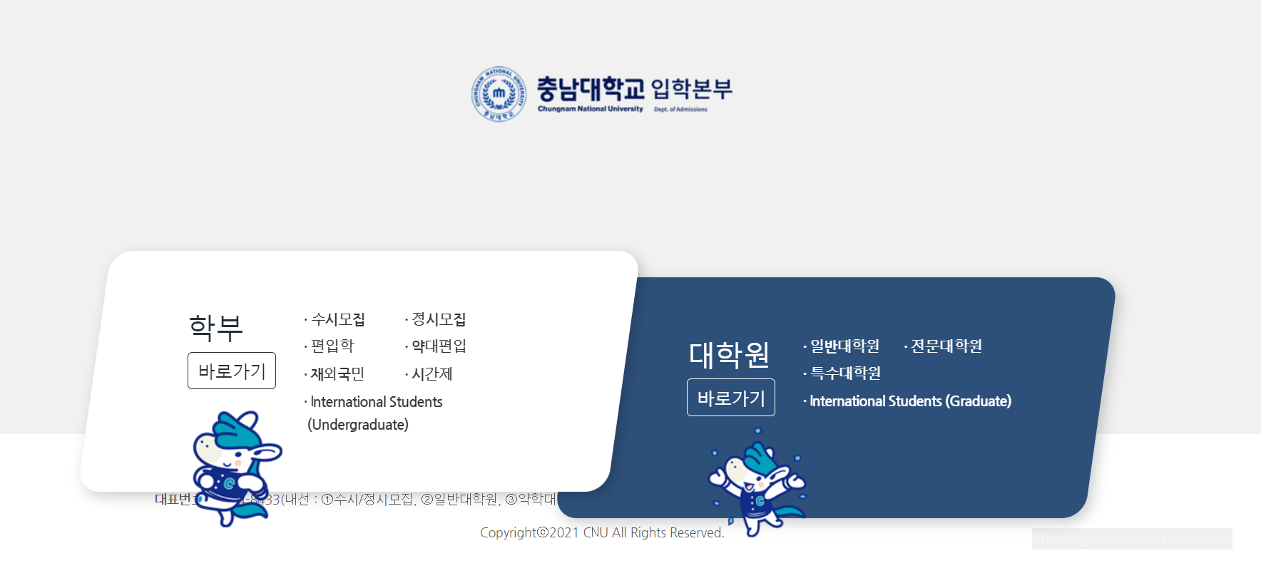 충남대 입학처 홈페이지는 먼저, 충남대학교 홈페이지에 접속하여 메뉴-입학-입학정보 순으로 접속하면 됩니다. 학부, 대학원으로 홈페이지가 구분되어있고 해당되는 홈페이지로 접속하면 됩니다. 아래 입학처 홈페이지 바로가기 URL을 이용해도됩니다.