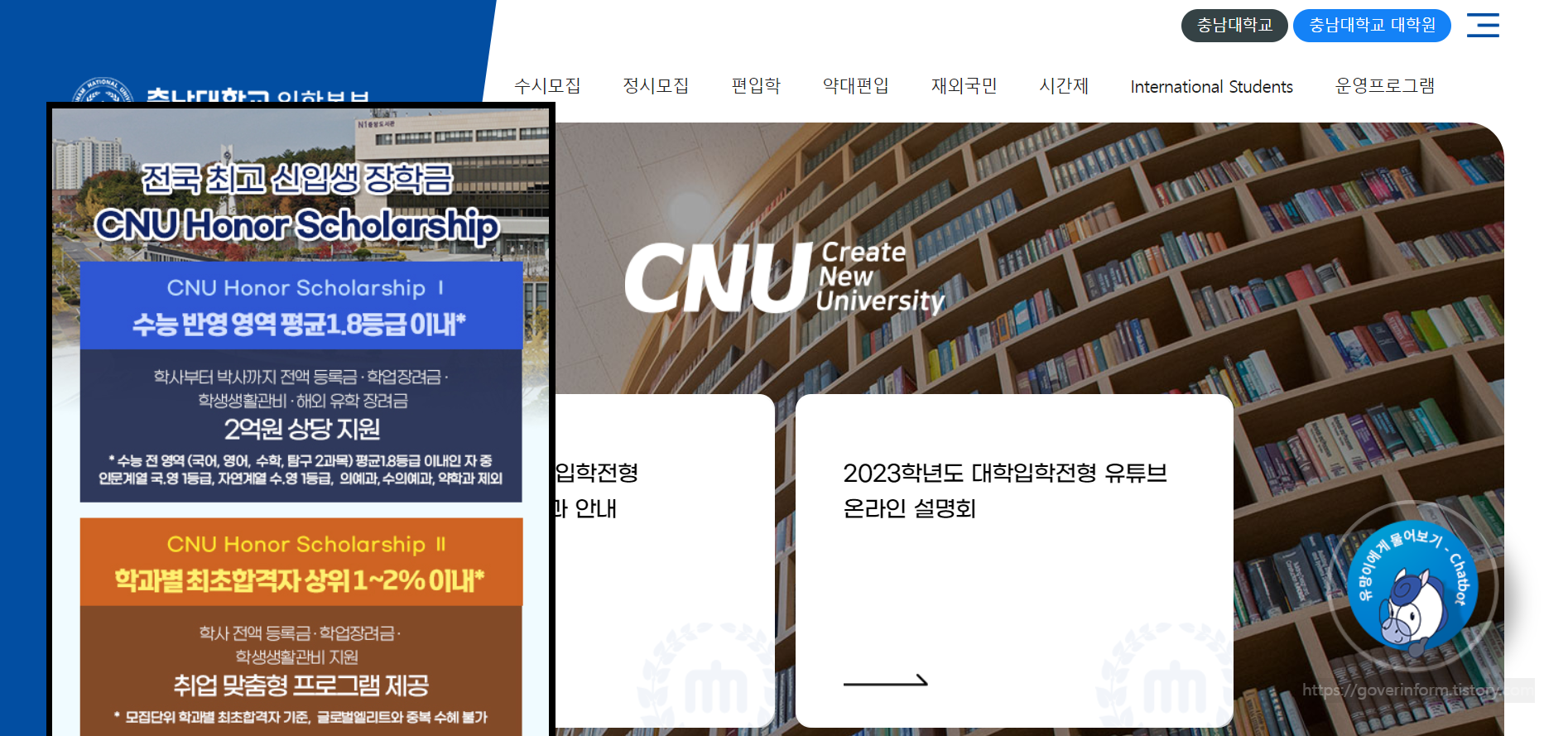 충남대 입학처 홈페이지입니다. 신입생 장학금에 대한 안내가 팝업창으로 나옵니다.