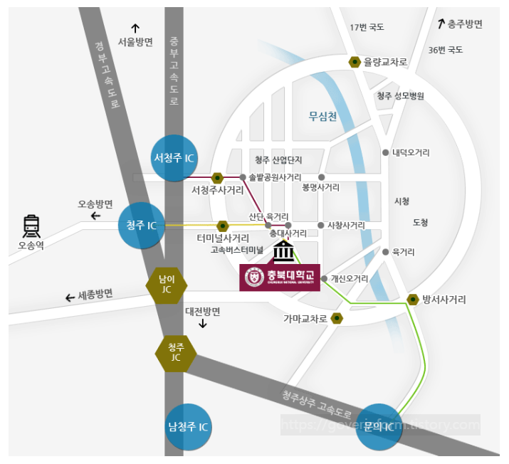 다음은 충북대 본교 캠퍼스 위치입니다. 충북 청주시 서원구 충대로1에 위치하고 있으며 철도 이용시 오송역, 조치원역, 고속버스 이용시, 청주고속버스터미널을 이용하면 됩니다. 시외버스터미널 앞 정류장에서 시내버스 이용시 충북대 입구 정류장에 하차할수 있으며 하차 후 도보로 이동하면 충북대 캠퍼스에 금방 도착합니다. 오송, 오창 캠퍼스는 아래 충북대 캠퍼스 전체보기에서 확인하시기 바랍니다.