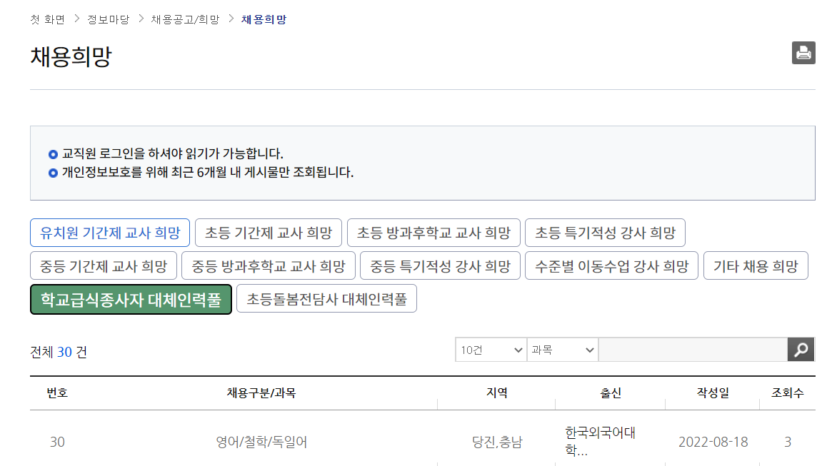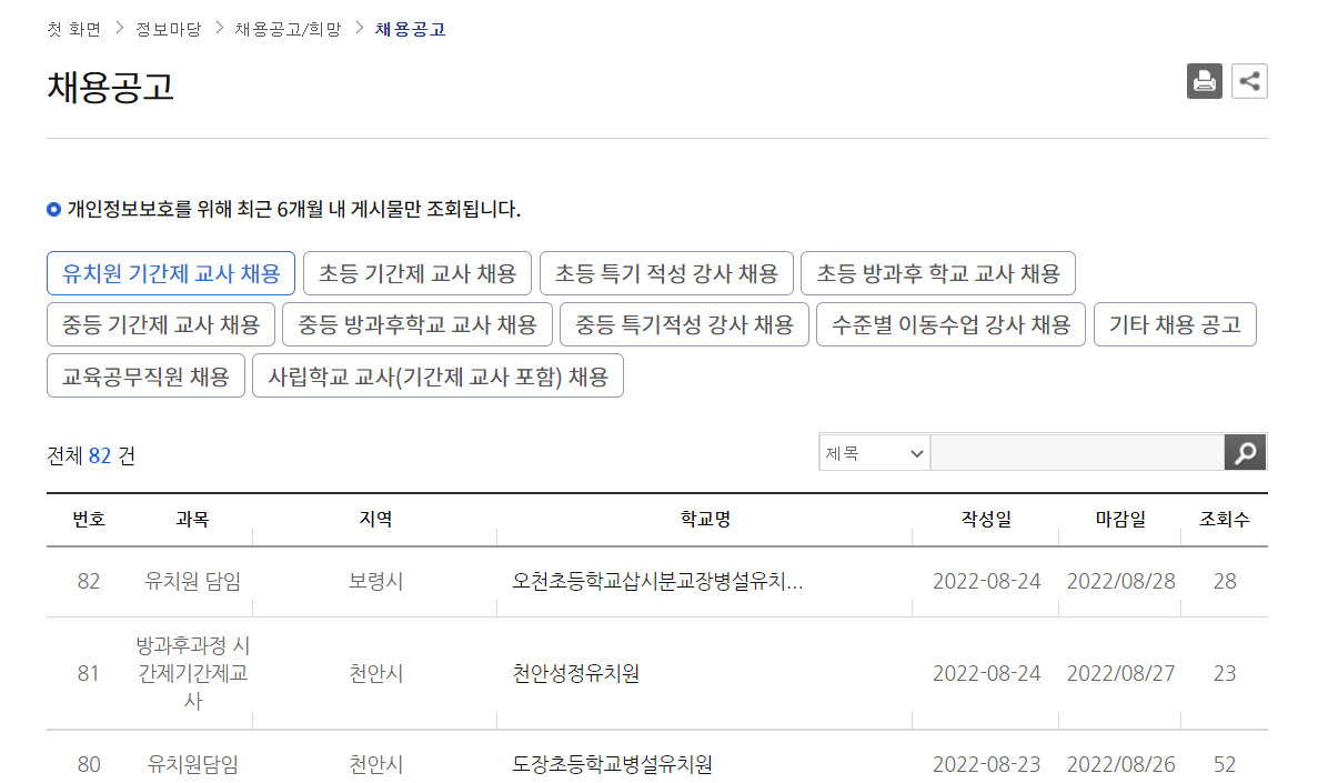 채용공고에는 유치원 기간제 교사, 초등 기간제 교사, 초등 특기 적성 강사, 초등 방과후 학교 교사, 중등 기간제 교사, 중등 방과후학교 교사, 중등 특기적성 강사, 수준별 인동수업 강사, 교육공무직원, 사립학교교사 채용정보가 올라옵니다.