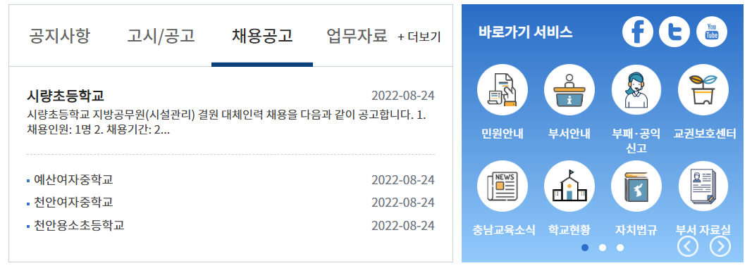 접속하면 다음과 같이 충청남도교육청 홈페이지 첫화면이 있습니다. 첫화면에서 스크롤을 조금만 더 아래로 내리면 채용정보를 바로 확인할수 있습니다.