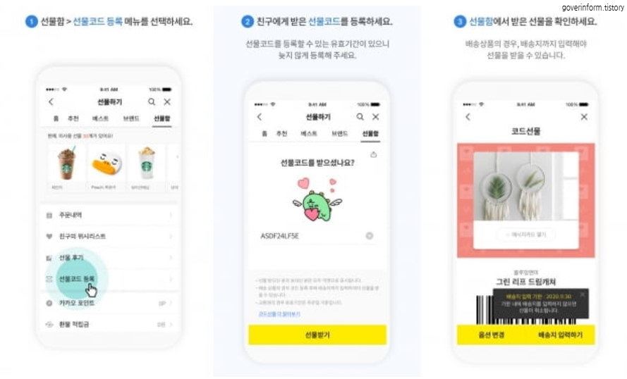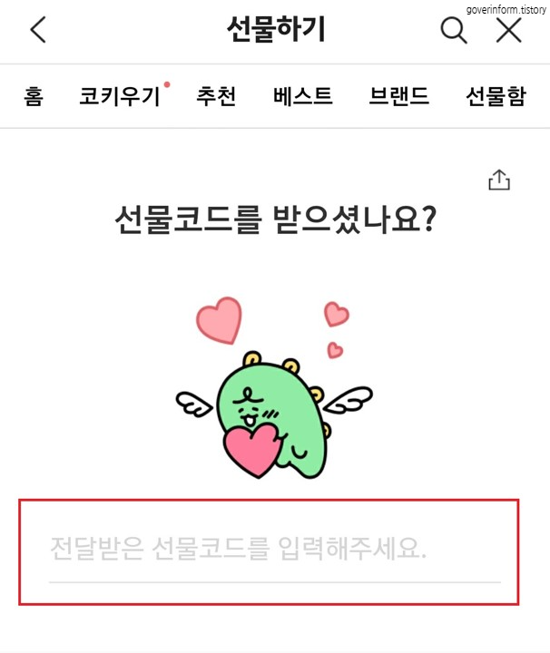 4. 받는 사람은 카카오톡 선물함에서 '선물 코드 등록'을 눌러 코드를 입력하고 선물을 받을 수 있습니다.