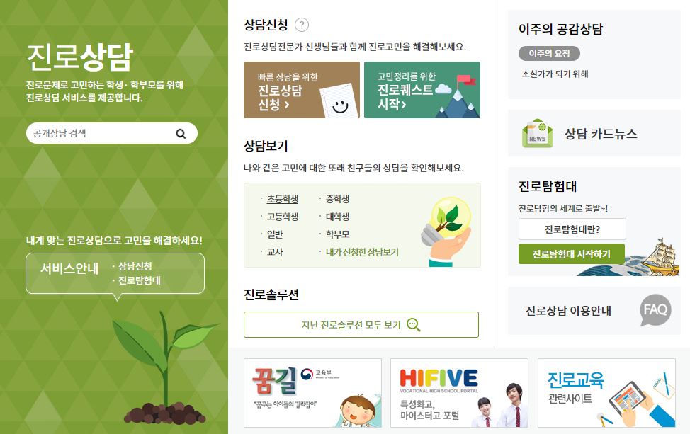 마지막으로 진로에 대한 고민이 있는 학생이나 학부모는 진로상담 서비스를 이용하면 됩니다. 진로상담 전문가 선생님이 진로상담을 해주며 커리어넷 홈페이지에서 신청후 이용 가능합니다.